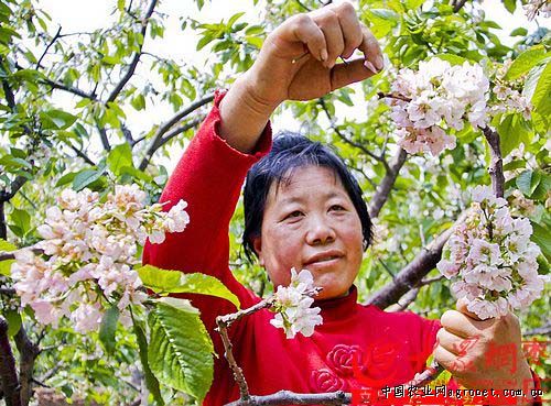4月18日,枣庄市山亭区水泉镇赵岭村妇女郑昌云在果园为樱桃树人工疏花。