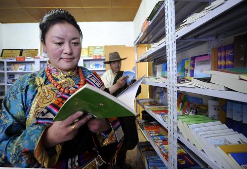 4月24日,藏族妇女德吉拉宗在农家书屋里看书。