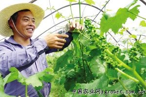 4月27日,在兰亭镇的兰亭葡萄园里,园主张张标在给开始扬花结果的葡萄剪枝打杈,以确保葡萄产量和质量。