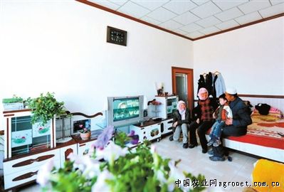 村民马玉清将我们让进了家里,妻子海国芳急忙掀帘迎客。屋子被收拾得干净整洁,三开门的冰箱、红黑色相间的沙发、玻璃茶几和马玉清夫妇绽放在脸上的笑容,和谐相融。