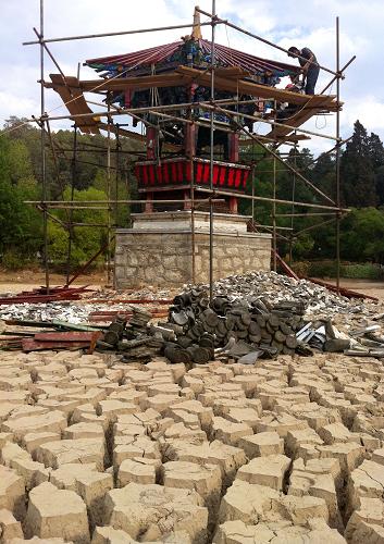 5月10日,丽江市著名景区黑龙潭公园干涸见底,工人修葺潭中的亭子。