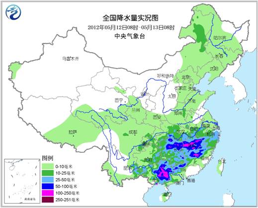 中国天气网讯 5月12日08时至13日08时,湖南北部、江西北部和东部、福建西部、广西中东部和广东西北部等地降雨量有50~100毫米,湖南东北部、江西北部、福建西部、广西中部等部分地区120~200毫米,广西桂平局地达237~251毫米。