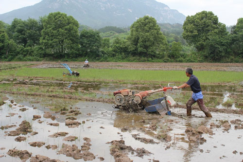 一位种粮大户告诉我们,农业机械的使用大大提高了劳动效率。一是抢农时。一台微型耕田机,能将过去用耕牛耕几天的田地1天完成,大中型机械更快,每天可作业15-20亩,一台插秧机每天可机插24亩地,相当于48个劳动力。大大缩短了耕田和插秧时间。二是提高作业质量。过去用耕牛耕田,耕深不到10cm,而机耕耕深可达20 cm,促进了深耕细作。三是提高产量。因机械作业质量好,每亩可提高产量近百斤。四是节本增效。使用耕牛犁田,每亩成本约200元,而雇请“铁牛”机耕,每亩付费100元;使用插秧机机插成本不到人工插秧的一半,经测算,每百亩种粮大户机耕机插可节本增收2万多元,另外拥有机械的大户在自己的田地耕作完成后,可为其他老百姓提供服务创收。
