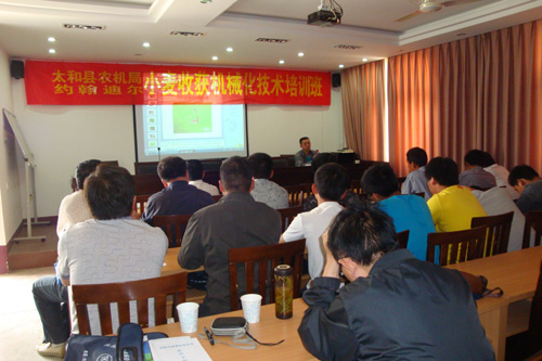 为落实农业机械化教育培训大行动实施方案,2012年5月15日,太和县农机局与约翰迪尔佳联公司在农机局五楼多媒体教室,共同举办小麦收获机械化技术培训班,讲解联合收获机械的操作、调整、保养、维修以及农机安全生产知识。县农委领导、农机局领导、局属各单位人员,各乡镇部分农业机械操作人员参加了培训班。