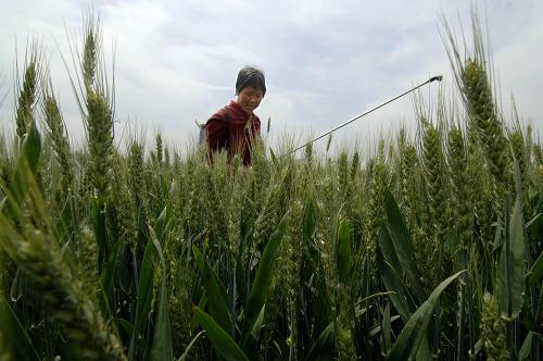 5月16日,在山东省高唐县固河镇南刘村,农民刘迎春正在为小麦喷施叶面肥。