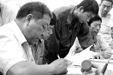 5月16日,农户正在和武陟县卓成农机合作社签订麦收作业合同。虽然离麦收还有一段时间,武陟县各家农机合作社已开始着手备战“三夏”。目前,该县70家农机合作社已签订小麦机收作业合同10万余份,订单作业面积超过45万亩,占全县麦收面积的90%。
