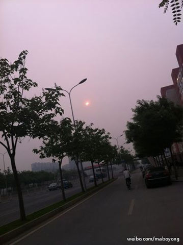 21日晨,北京天气阴,天空可见日偏食(图片来源:新浪微博)