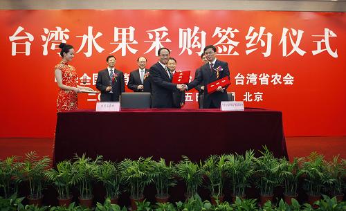 当日,中华全国供销合作总社台办与台湾省农会在京举办台湾水果采购签约仪式。供销总社下属企业与台湾部分农会签署了分批采购1500吨台湾水果的贸易合作备忘录。新华社发