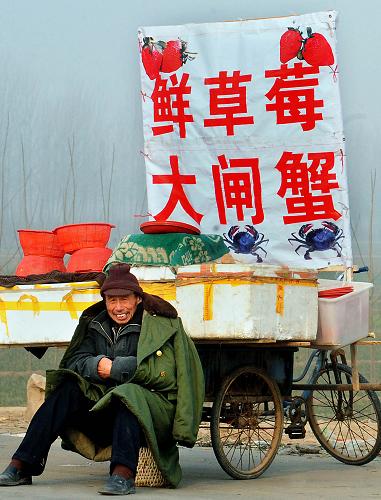在河南省中牟县雁鸣湖镇,一位农民在路边售卖他种养的草莓和大闸蟹(2011年12月9日摄)。据郑州市农调队提供的数据,2011年,郑州市农民人均纯收入达到11050元,同比增长19.8%,不仅首次突破万元大关,而且与周边省会城市(济南、武汉、西安、太原、合肥、石家庄)相比,也位居首位。数据显示,去年郑州市农民的工资性收入、家庭经营纯收入和非生产性纯收入的同比增长分别为38.7%、4.3%和6.7%。其中,工资性收入的快速增长成为郑州农民收入增长的主要因素。新华社记者 王颂 摄