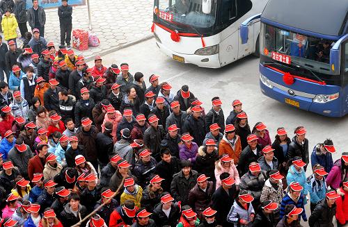 在河南人才资源市场内,一批经过培训的郑州籍外出务工人员准备乘车启程(2011年2月18日摄)。新华社记者 王颂 摄