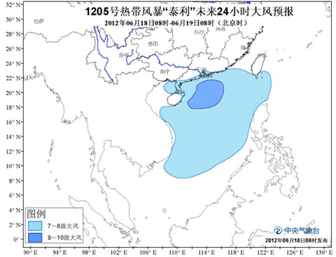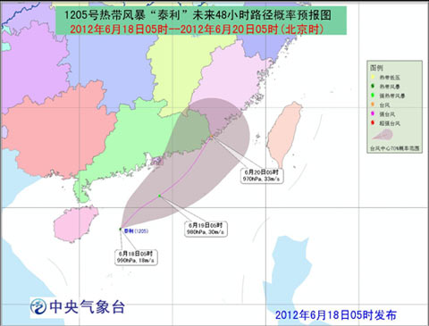 原位于南海北部海面的热带低压已于6月17日23时发展为今年第5号热带风暴“泰利”(Talim,名字来源:菲律宾,名字意义:明显的边缘),18日05时其中心位于海南省文昌市东南方大约140公里的海面上,就是北纬18.9度、东经112.2度,中心附近最大风力有8级(18米/秒),中心最低气压为990百帕。