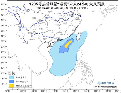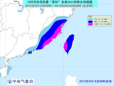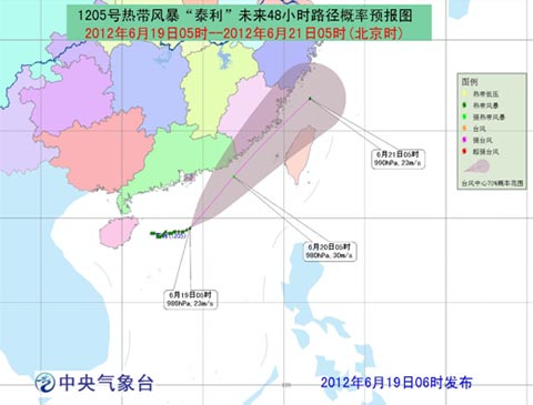 预计,“泰利”将以每小时10-15公里的速度向东偏北转东北方向移动,强度将有所加强,并将于19日夜间到20日白天擦过广东东部到福建中部一带沿海,沿台湾海峡北上。受“泰利”和西南季风的共同影响,19日08时至20日08时,南海大部、海南南部沿海、广东中东部沿海、福建中南部沿海、台湾海峡、巴士海峡、巴林塘海峡、台湾以东洋面将有6-8级大风,部分海域阵风可达9-10级;“泰利”中心经过的附近海面或地区的风力有9-11级,阵风可达12-13级;浙江南部、福建大部、台湾、广东东部、海南东部和西南部有大到暴雨,其中福建东部、广东东南部、台湾西南部等地的部分地区有大暴雨(100~180毫米)。
