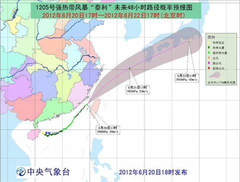 今年第5号热带风暴“泰利”(Talim)于20日11时前后进入台湾海峡南部海面,下午再次加强为强热带风暴,20日17时其中心位于我国台湾省新竹市西偏南方大约150公里的台湾海峡中部海面,就是北纬24.3度、东经119.5度,中心附近最大风力有10级(28米/秒),中心最低气压为980百帕。