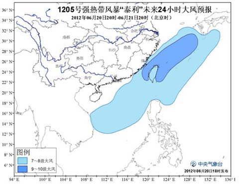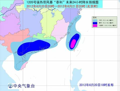 预计,“泰利”将以每小时35公里左右的速度向东北方向移动,将于今天夜间由台湾海峡进入东海南部海面,强度缓慢减弱。受“泰利”和西南季风的共同影响,20日20时至21日20时,南海大部海域、东海大部海域、台湾海峡、台湾以东洋面、巴士海峡以及福建沿海、台湾沿海、浙江中南部沿海将有7-8级的大风,部分海域或地区阵风可达9-10级,“泰利”中心经过的附近海域的风力有9-10级,阵风可达11-12级;浙江东南部和福建东北部沿海、台湾、广东中南部、广西东部、海南北部等地将有大到暴雨(30-80毫米),其中台湾西南部的部分地区有大暴雨(120-200毫米),局地有特大暴雨(300-500毫米)。