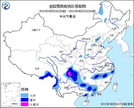 预计,24日20时至25日20时,浙江中南部、福建西北部、江西北部、广东中西部、广西北部和东部、四川盆地西部和南部、云南西部、贵州北部和东南部等地的部分地区有大到暴雨,局地有大暴雨(100-120毫米)。另外,西藏东南部、内蒙古东北部、华北北部的局部地区有大雨,局地有暴雨并伴有短时雷雨大风或冰雹等强对流天气。