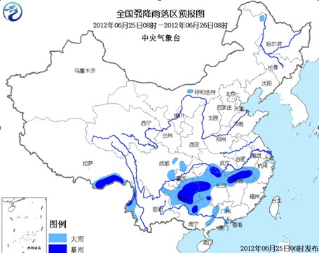 中央气象台6月25日06时继续发布暴雨蓝色预警: