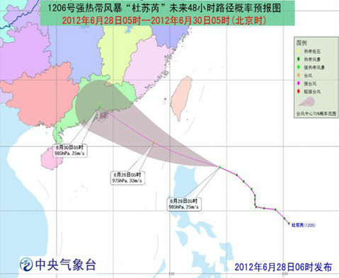 今年第6号热带风暴“杜苏芮”已于28日凌晨加强为强热带风暴,28日05时其中心位于我国香港东偏南方约1160公里的菲律宾东北部洋面上,就是北纬18.4度、东经124.4度,中心附近最大风力有10级(25米/秒),中心最低气压为985百帕。
