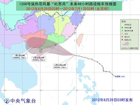 今年第6号强热带风暴“杜苏芮”的中心已于29日凌晨进入南海东北部海面,29日05时“杜苏芮”的中心位于香港东南方约580公里的海面上,就是北纬19.7度、东经118.9度,中心附近最大风力有10级(25米/秒),中心最低气压为985百帕。