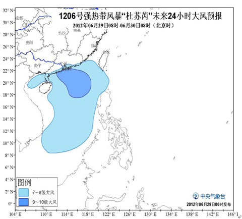 受其影响,29日08时到30日08时,南海大部、广东沿海及珠江口地区、巴士海峡、巴林塘海峡、北部湾将有6-8级大风,“杜苏芮”中心经过的附近海面或地区的风力有9-10级,阵风可达10-11级;广东、海南及台湾等地将有中到大雨,其中广东南部、海南中东部、台湾南部等地的部分地区有暴雨,广东中西部沿海局地有大暴雨。
