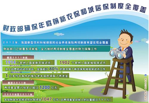 2012年,我国新型农村和城镇居民社会养老保险两项制度有望实现全覆盖。记者6日从财政部获悉,为确保这一目标如期顺利实现,财政部门已部署多项举措,全力做好两项制度全覆盖的财力保障工作。