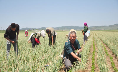 6月28日,宁安市宁安镇福荣村的大蒜田内,20多名“计时农民”正在帮助劳动力不足的农户收获蒜薹。