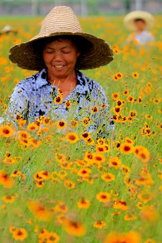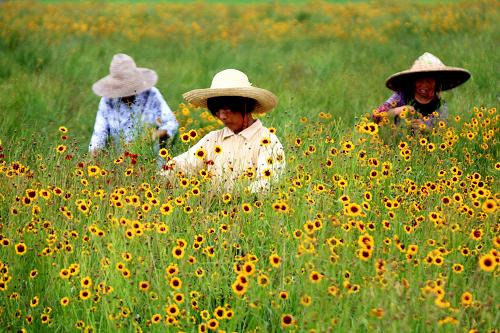 7月12日,菊农冒着高温在安徽省黄山市休宁县农业基地采摘雪菊。