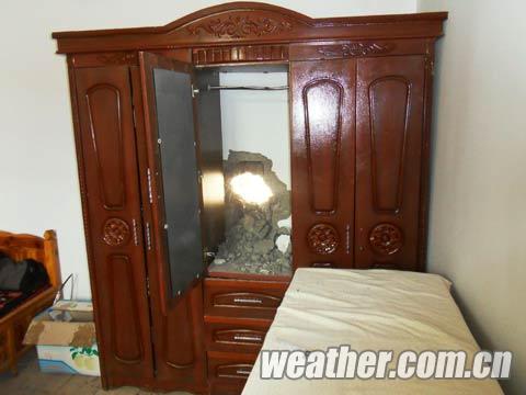 山体滑坡的石块击穿墙壁和大衣柜,从衣柜里流出。(摄影:李全平 周举恒 赵全宁)