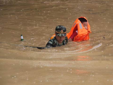图为16日贵州多地暴雨,消防官兵正在帮助一名儿童脱困。(图片来源:新华社)
