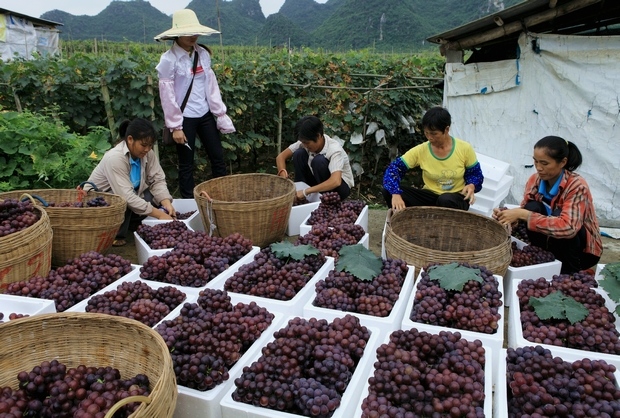 7月初,葡萄成熟,为赶出时间给二季葡萄生产剪枝,柳江县葡萄基地忙着采收葡萄果出卖。随着新鲜葡萄一车车外运,柳江县春季葡萄已销售一半多,还有一个星期,葡萄收获完毕。据该县农业部门统计,至7月15日,全县春季葡萄果已销售1.3万吨,约占总产量的55%,平均收购价5.2元/公斤,比去年少0.7~1元/公斤。全县春季葡萄总产量预计2.3万吨,比去年增产15%,总产值1.29亿元,与去年持平。
