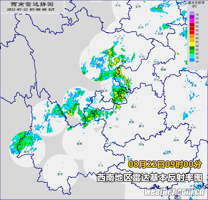 22日9-10时,西南地区的雷达降水回波分布零散,稳定少动,四川东部、重庆南部、贵州西北部的雷达回波强度普遍较弱,雷达回波强度只有15 dBz左右,最强雷达回波在四川东部、重庆南部的局地,强度达到45 dBz左右,伴随有局地性较强的中等强度降雨出现。对应在1小时降雨量上,四川射洪、宜宾、长宁等地、贵州赫章、毕节、大方、威宁和重庆璧山、江津等地降雨量普遍达到了1小时25-40毫米,均超过短时暴雨量级,其中贵州赫章局地自动气象站1小时降雨量最大60毫米。