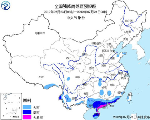 预计,23日08时至24日08时,广东大部、广西大部、海南、福建东部、云南西部和南部、江西南部、湖南南部和北部、山东半岛东部和北部等地有大雨或暴雨,其中,广东南部沿海、海南东北部等地的局部地区有大暴雨(100~200毫米)。上述局部地区并将有短时雷暴大风等强对流天气。