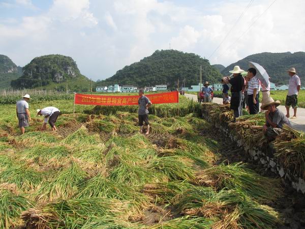 7月19日,受自治区农业厅委托,桂林市农业局组织种植业管理科科长刘日黎、推广站站长蒋德赏等专家在临桂县农业局李全德局长一行的陪同下对我县2012年早稻万亩高产创建示范片进行现场测产验收。