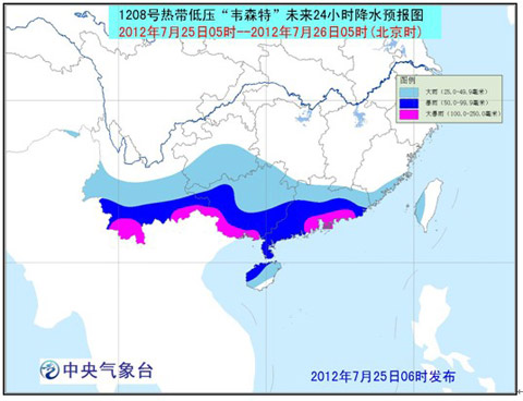 但受“韦森特”和西南季风的共同影响,我国南部海区和华南仍将持续较明显的风雨天气,25日08时至26日08时,南海大部、北部湾、琼州海峡、广东沿海、海南沿海、广西沿海仍将有6-7级大风,部分海域和地区的阵风可达8级;广东大部、海南大部、广西大部、贵州中南部、云南中南部、福建南部沿海和台湾西南部等地有大到暴雨,其中,广东南部沿海、广西南部、云南南部等地的部分地区有大暴雨(100~180毫米)。