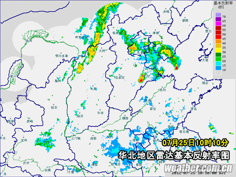 中国天气网讯 25日10-11时,内蒙中东较强雷达回波(35-40dBz)区向东缓慢移动;影响河北东南部、北京的回波区(回波强度达45-50dBz)逐渐向东北方向移动,11时强雷达回波区(40-50dBz)位于河北沧州一带,局部地区10-11时一小时降雨超过40毫米。