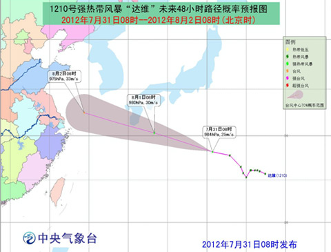 预计,“达维”将以每小时30-35公里的速度向西偏北方向移动,强度继续加强,将于8月1日晚上进入东海东北部海面,然后向江苏南部到山东半岛南部沿海靠近。