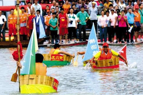 最令人惊喜的,是南沙特色水上竞赛――“扒禾桶”,参赛队员使用的“道具”是一个个类似洗澡桶的木桶。选手们双脚要蹲在桶内保持平衡,双手分别划着一个像大锅铲一样的小桨,努力冲向河中的木杆上“采青”。这种新奇又可爱的竞赛,引起了岸上万余观众的好奇,纷纷用相机拍下精彩一幕。