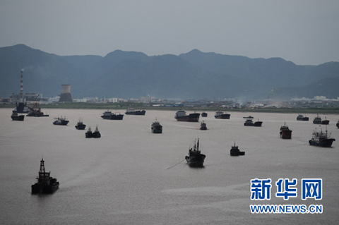 8月6日,船只从海上回到浙江台州椒江的港湾内避风。(图片来源:新华网)