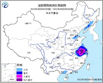 预计8日20时至9日20时,受“海葵”影响,浙江中北部、上海、江苏中南部、安徽中南部、江西东北部等地有大到暴雨,其中,浙江西北部、安徽中南部、江苏西南部等地的部分地区有大暴雨,局地有特大暴雨(250~350毫米)。