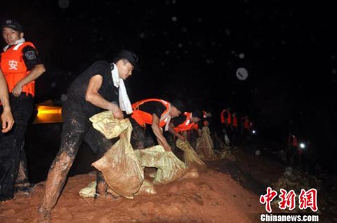 11日凌晨,景德镇市城防大堤西瓜洲段出现险情,景德镇市公安局特警支队民警立即赶到城防大堤西瓜洲段,连夜加固3米宽、近百米长的城防大堤。 石卫明 摄