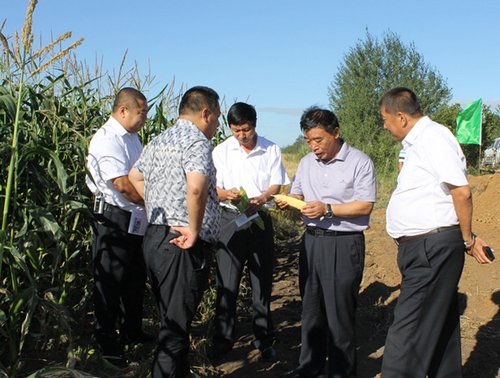 扎兰河农场六队种植户张全忠的150亩玉米,由于严格按照科学管理,长势良好,被树立为扎兰河农场万亩玉米示范田。图为总经理李洪斌在地头检查指导玉米后期管理及收获事宜。