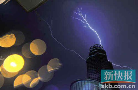 广州天河岗顶附近,电弧伴着大雨不断划破黑夜长空。(图片来源:金羊网新快报)
