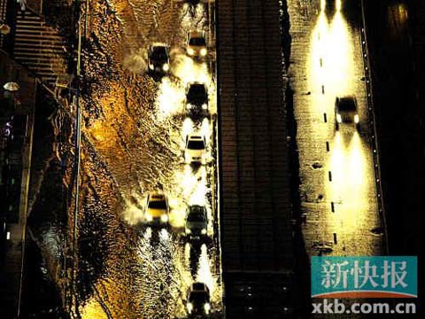 广州BRT石牌桥站附近,车辆小心通过水浸路段。(图片来源:金羊网新快报)