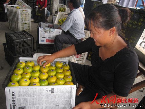 8月21日,在湖北宜昌夷陵区的老胡柑橘打蜡场里,工人们正在包装、贴标签首车8吨特早熟柑橘,柑橘当晚就将启程驶往东北省。