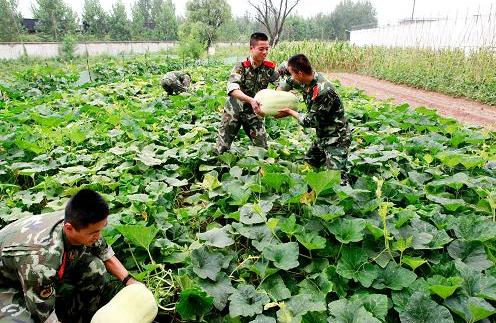 8月22日,武警淮北市支队濉溪县中队的战士们在采摘冬瓜。
