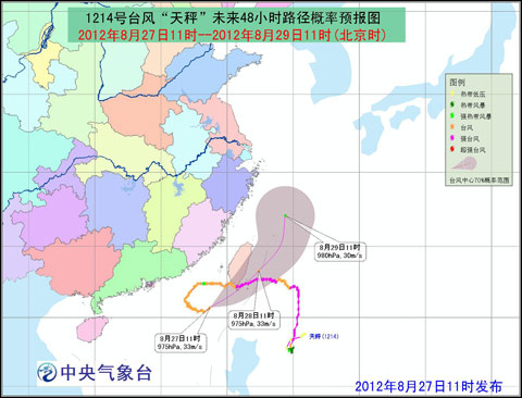 受“天秤”影响,27日14时至28日14时,南海东北部海域、台湾南部沿海、巴士海峡、巴林塘海峡、台湾以东洋面将有7-9级大风,“天秤”中心经过的附近海域或地区的风力可达10-12级,阵风13-14级;台湾海峡、广东东部沿海、福建沿海将有6-7级大风,部分海域和地区的阵风达8-9级。台湾省南部有大到暴雨,局部地区有大暴雨或特大暴雨。