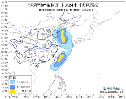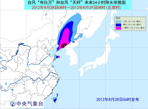 受“布拉万”和“天秤”影响,28日08时到29日08时,渤海、渤海海峡、黄海大部海域、东海南部和东部海域、台湾以东洋面、巴士海峡、巴林塘海峡、南海东北部海域、台湾沿海、江苏沿海、山东东部及沿海、辽宁沿海将有7-10级大风,部分海域有11-12级大风,“布拉万”和“天秤”中心经过的附近海域风力可达11-13级,阵风可达14-15级;山东半岛、辽宁大部、吉林、黑龙江中部、台湾等地有大到暴雨,其中,辽宁中东部、吉林中部、山东半岛东部的部分地区有大暴雨,辽宁东部局部地区有特大暴雨(250~300毫米)。