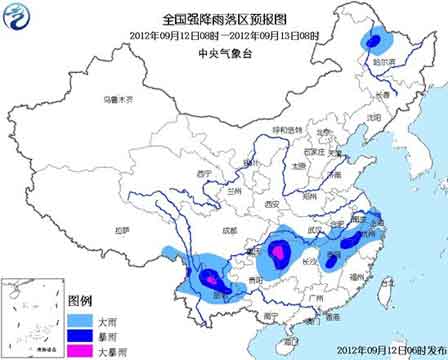 预计,12日08时至13日08时,黑龙江西北部、重庆东部和南部、四川南部、贵州东部和西南部、云南中北部、湖北南部、湖南北部、江西中北部、浙江北部等地有大雨,部分地区有暴雨,云南北部局地、鄂湘渝三省交界的局部地区有大暴雨(100~130毫米);上述部分地区并伴有雷暴等强对流天气。