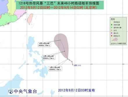 中国天气网讯 中央气象台消息,今年第16号热带风暴“三巴”的中心9月12日02时位于菲律宾马尼拉东南方大约1320公里的西北太平洋面上,即北纬11.6度,东经132.8度,中心附近最大风力8级(18米/秒),中心最低气压为1000百帕。