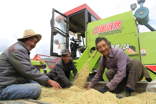 图为大型收割机使秋收变得轻松,工卡村民笑开怀。