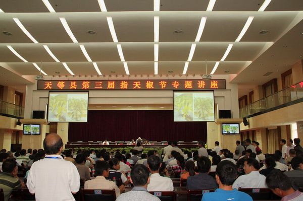 为进一步加快和促进指天椒特色产业的发展,天等县于2012年9月17-18日举办了第三届指天椒节,邀请有关农业专家、指天椒加工企业、全市相关单位、椒农参加了活动。17日,天等县首先安排参加活动人员参观了指天椒种植及加工基地,然后召开了指天椒产业发展专题讲座。讲座上,龙国夏、陆申年、朱桂宁等老教授针对天等县指天椒产业存在的问题进行了分析,并针对存在的问题提出了解决方法,并就指天椒病虫害防治、合理施肥技术进行深入浅出的讲解。